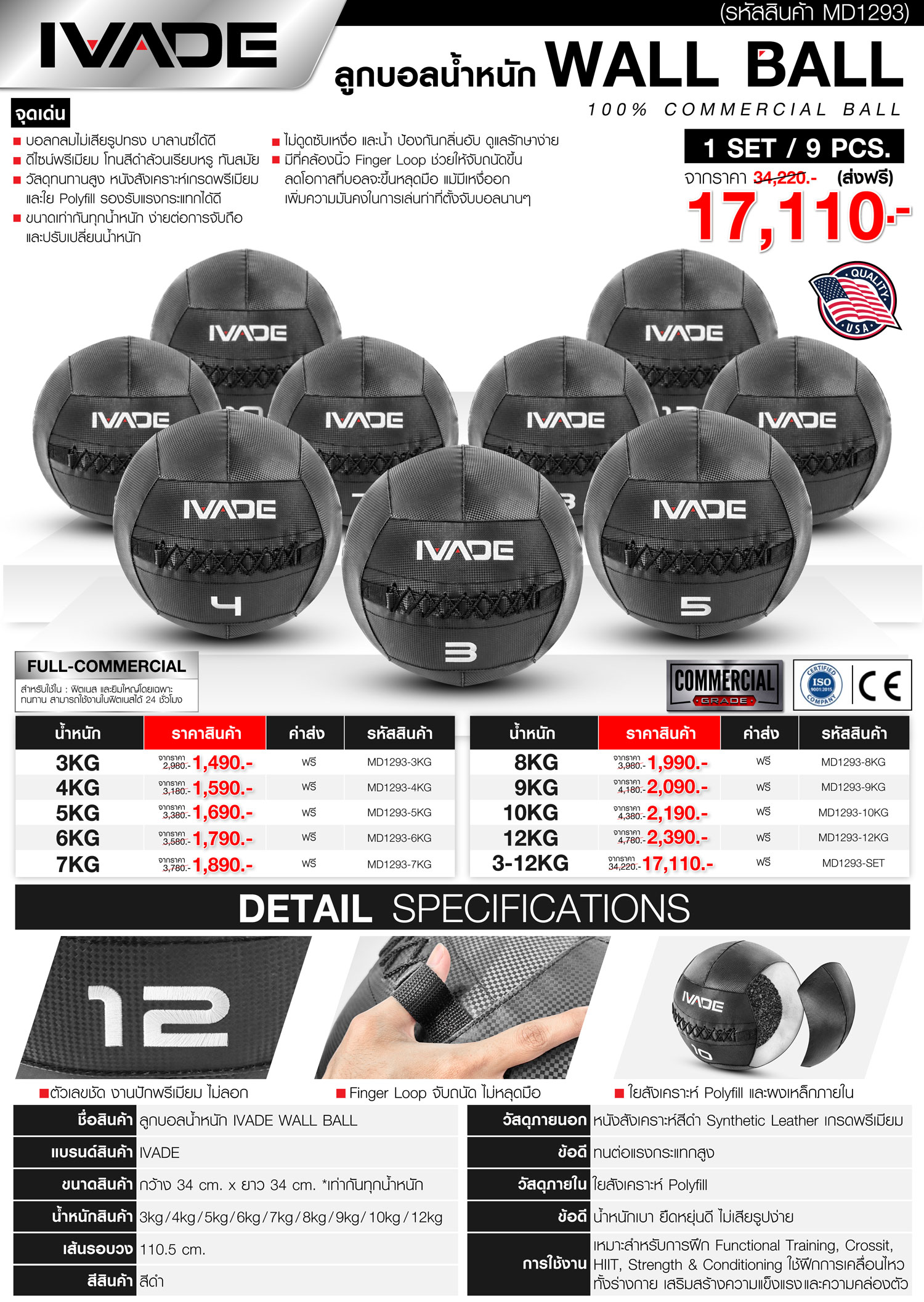 ชุดลูกบอลน้ำหนัก IVADE WALL BALL 3-12KG เกรดสำหรับใช้ใน ฟิตเนส และยิมใหญ่โดยเฉพาะ ดีไซน์พรีเมียม โทนสีดำล้วนเรียบหรู ทันสมัย บอลกลมไม่เสียรูปทรง บาลานซ์ได้ดี วัสดุทนทานสูง หนังสังเคราะห์เกรดพรีเมียม และใย Polyfill รองรับแรงกระแทกได้ดี เส้นรอบวง 110.5 cm มีที่คล้องนิ้ว Finger Loop ช่วยให้จับถนัด ไม่หลุดมือ ขนาดของสินค้า 34x34cm (กว้างxยาว)