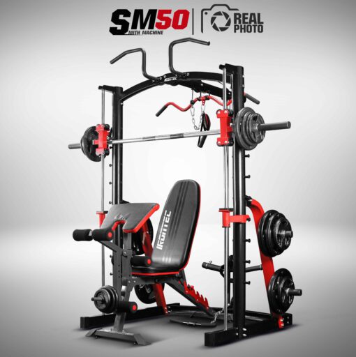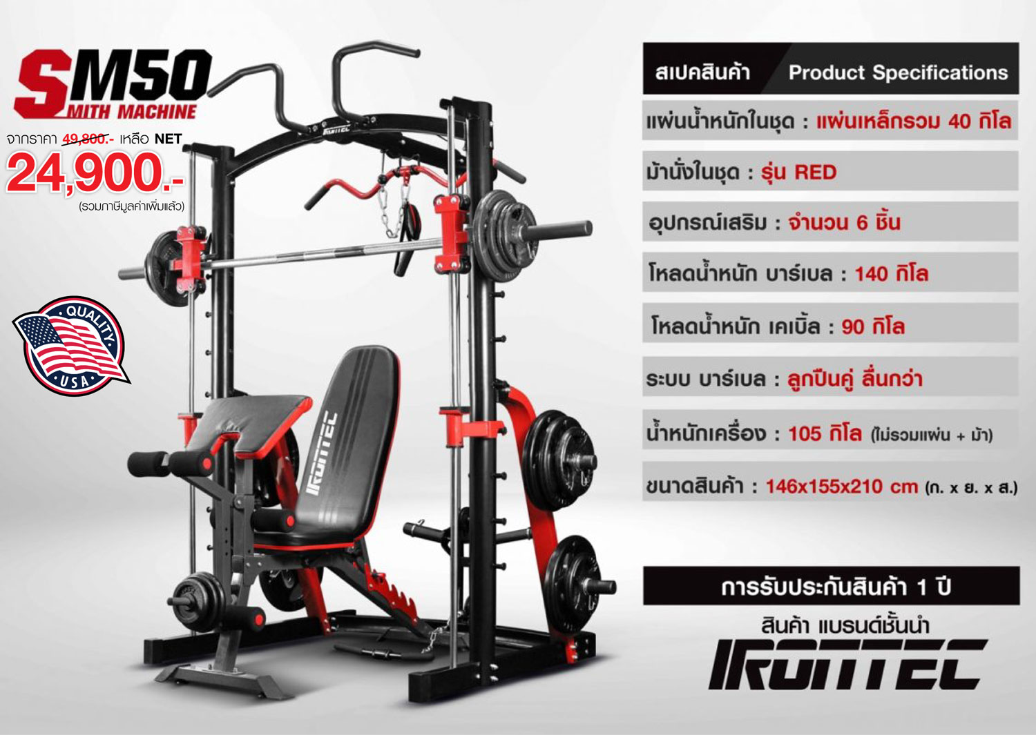 สมิท แมชชีน รุ่น SM50 จาก IRONTEC™ ใช้สร้างกล้ามได้ ทุกส่วน มี 3 ระบบใน 1 เครื่อง (1) ที่เล่นบาร์เบล (2) ที่เล่นเคเบิ้ล (3) ที่เล่นบาร์โหน อุปกรณ์เสริมครบ