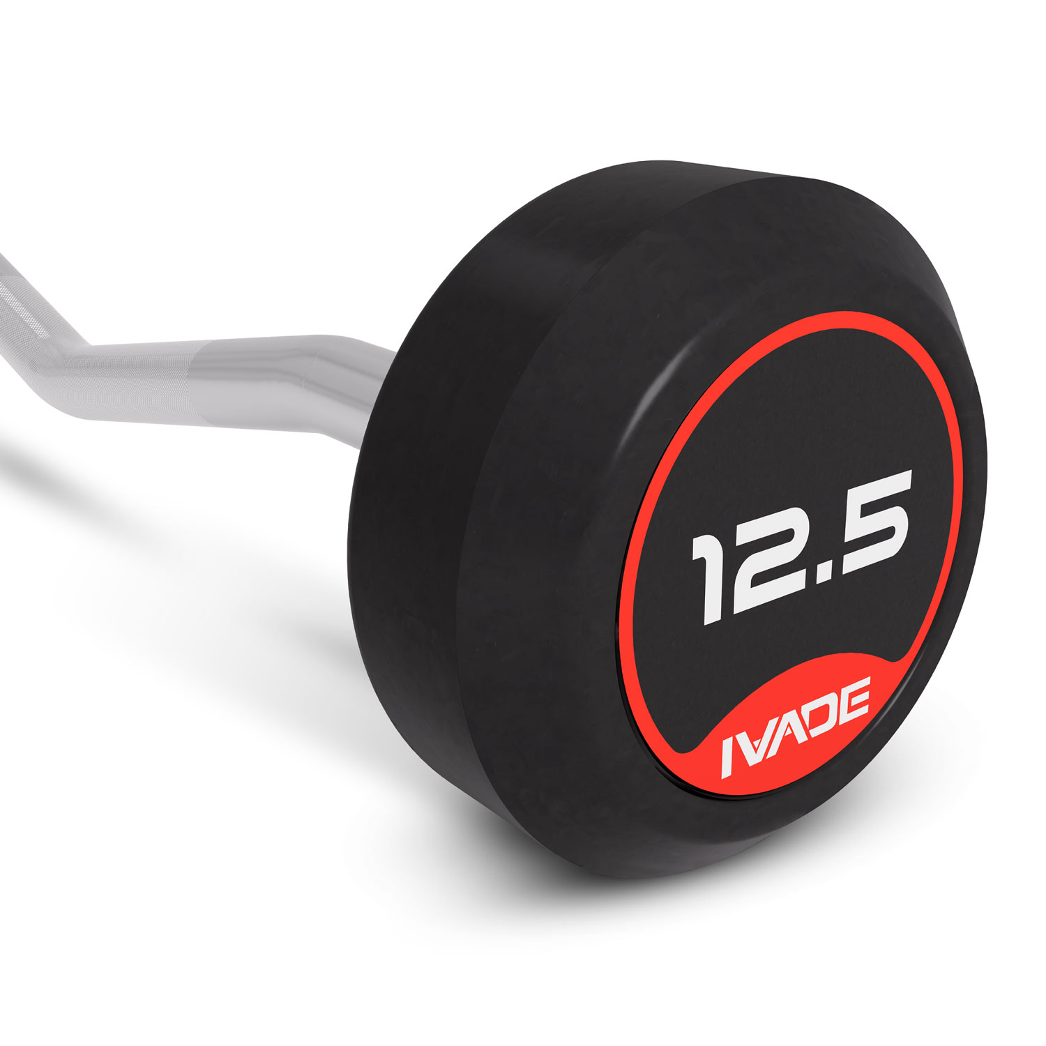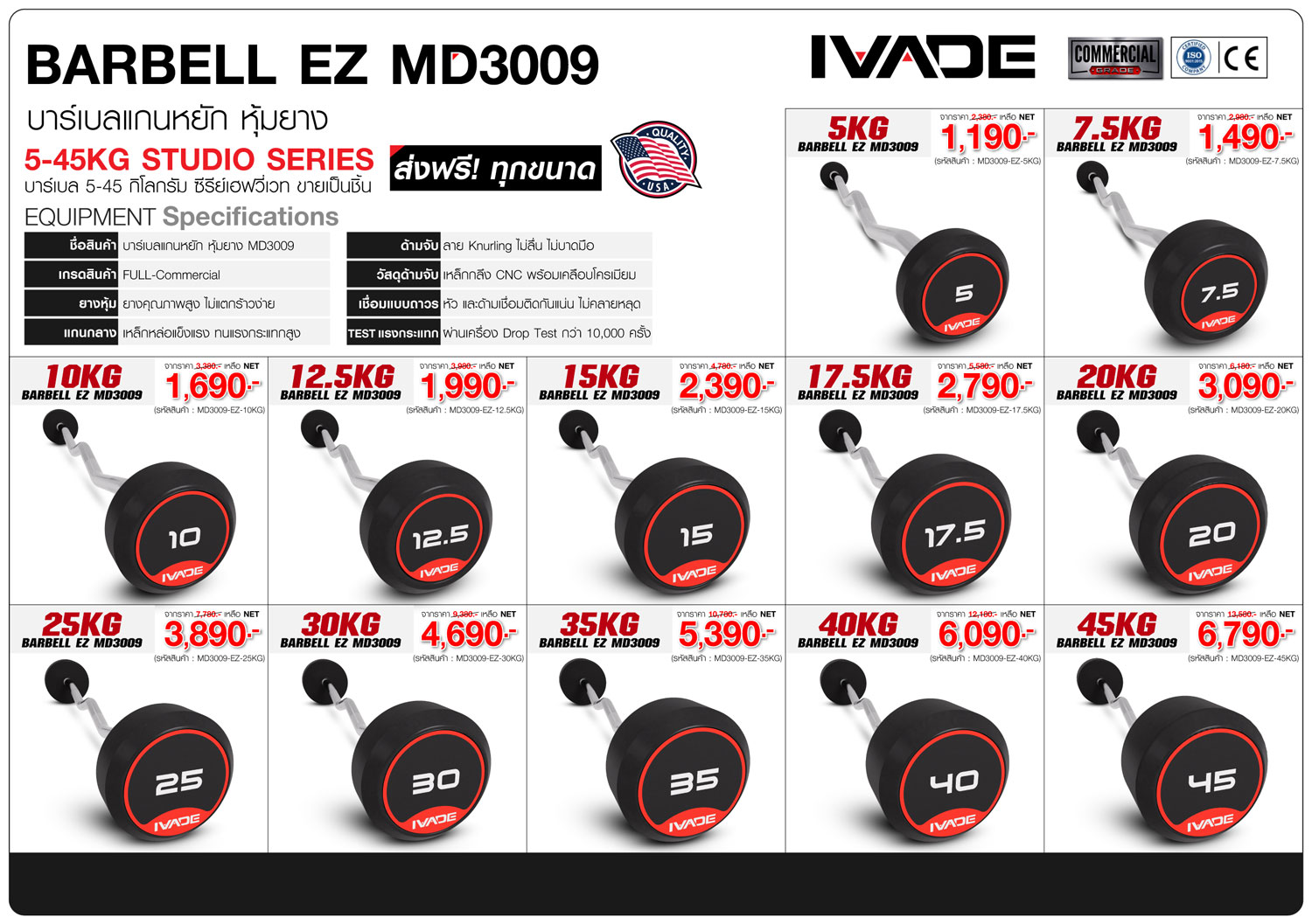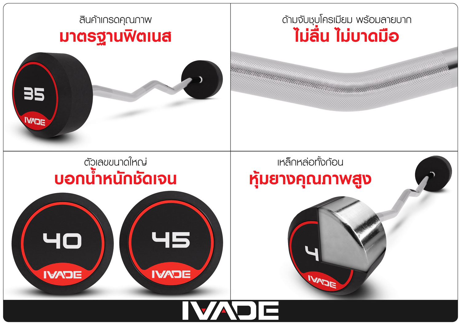 บาร์เบล แกนหยัก EZ หุ้มยาง IVADE ขนาด 12.5KG x 1 ชิ้น FULL-Commercial สินค้าใหม่ ยางหุ้มคุณถาพสูง ไม่แตกร้าวง่าย แกนกลาง เหล็กหล่อแข็งแรง ทนแรงกระแทกสูง ด้ามจับ ลาย Knurling ไม่ลื่น ไม่บาดมือ วัสดุด้ามจับ เหล็กกลึง CNC พร้อมเคลือบโครเมียม หัว และด้ามเชื่อมติดกันแน่น ไม่คลายหลุด