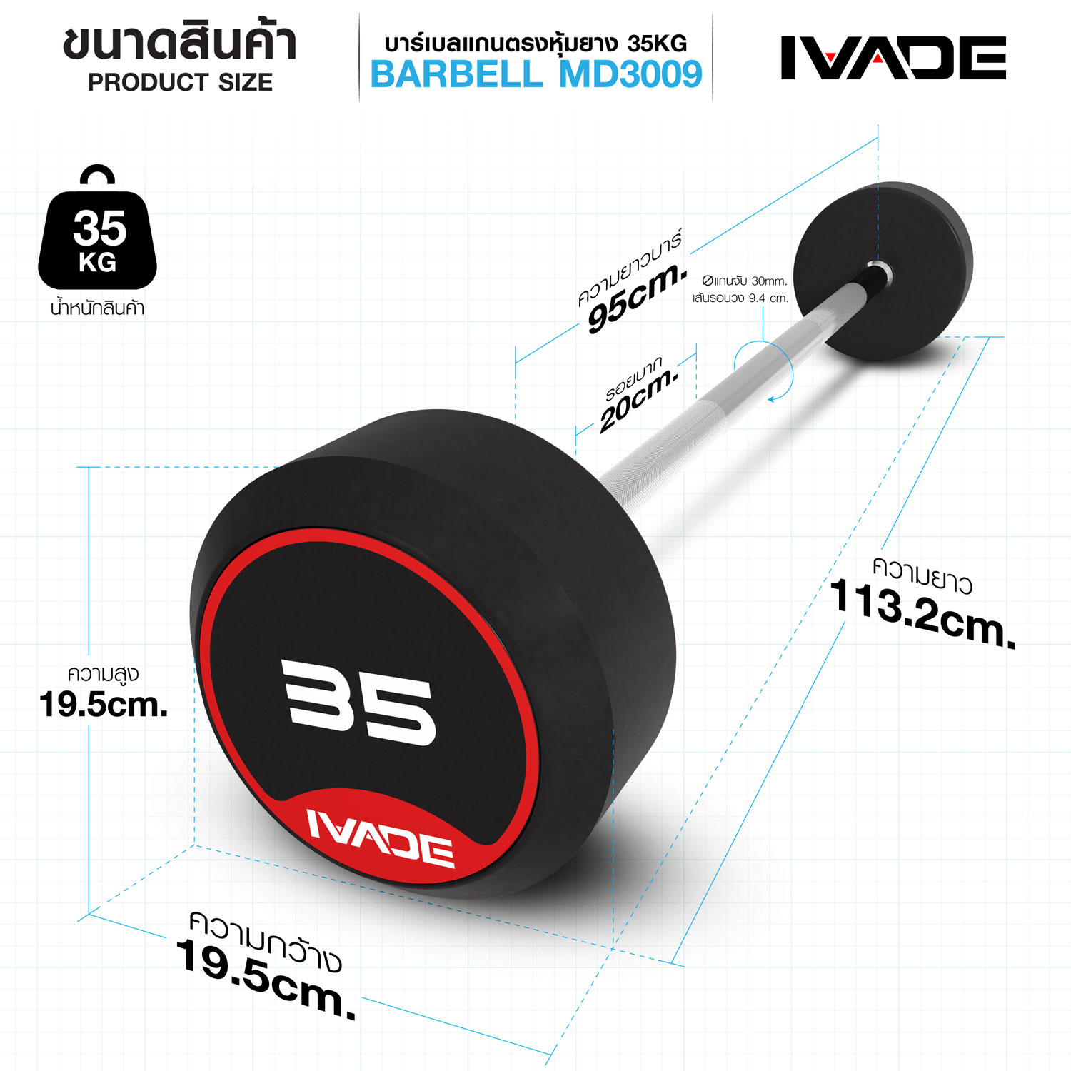 บาร์เบล แกนตรง หุ้มยาง IVADE ขนาด 35KG x 1 ชิ้น FULL-Commercial สินค้าใหม่ ยางหุ้มคุณถาพสูง ไม่แตกร้าวง่าย แกนกลาง เหล็กหล่อแข็งแรง ทนแรงกระแทกสูง ด้ามจับ ลาย Knurling ไม่ลื่น ไม่บาดมือ วัสดุด้ามจับ เหล็กกลึง CNC พร้อมเคลือบโครเมียม หัว และด้ามเชื่อมติดกันแน่น ไม่คลายหลุด