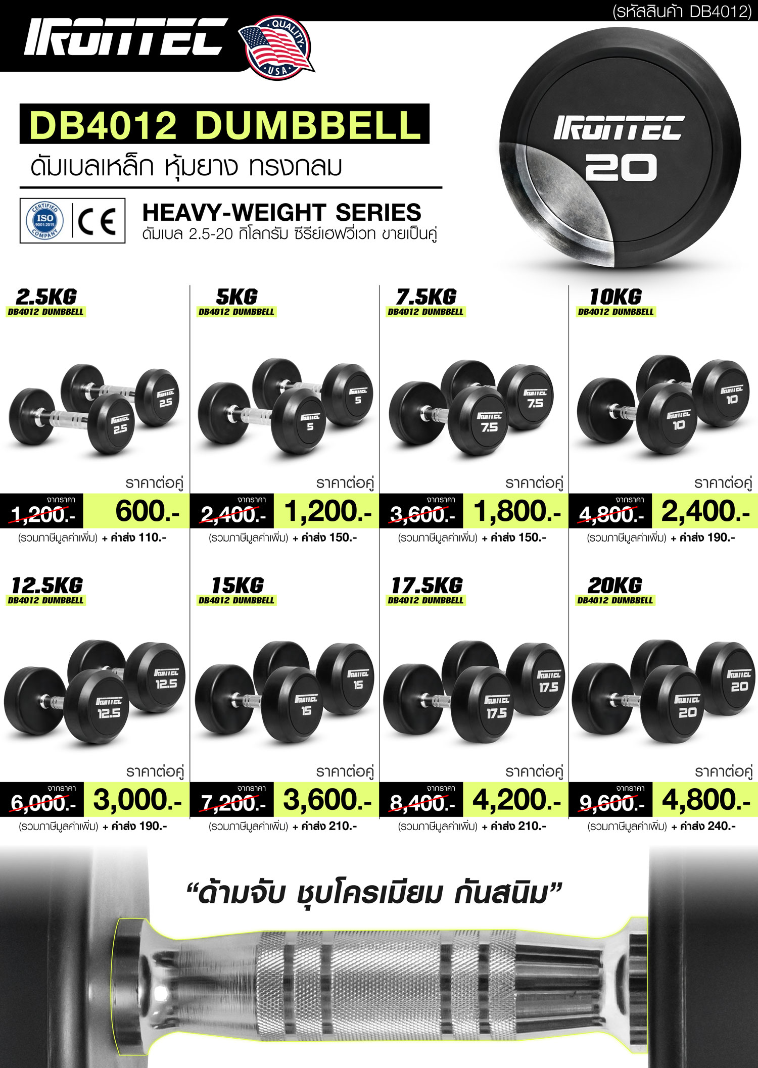 ดัมเบลกลม หุ้มยาง IRONTEC ขนาด 5KG x 2 ชิ้น วัสดุข้างในเป็นเหล็ก แล้วหุ้มด้วยยางอย่างดี จับถนัดมือ ลดแรงกระแทกและเสียงรบกวน (ค่าส่งสินค้าทั่วประเทศ 150 บาท ต่อคู่)