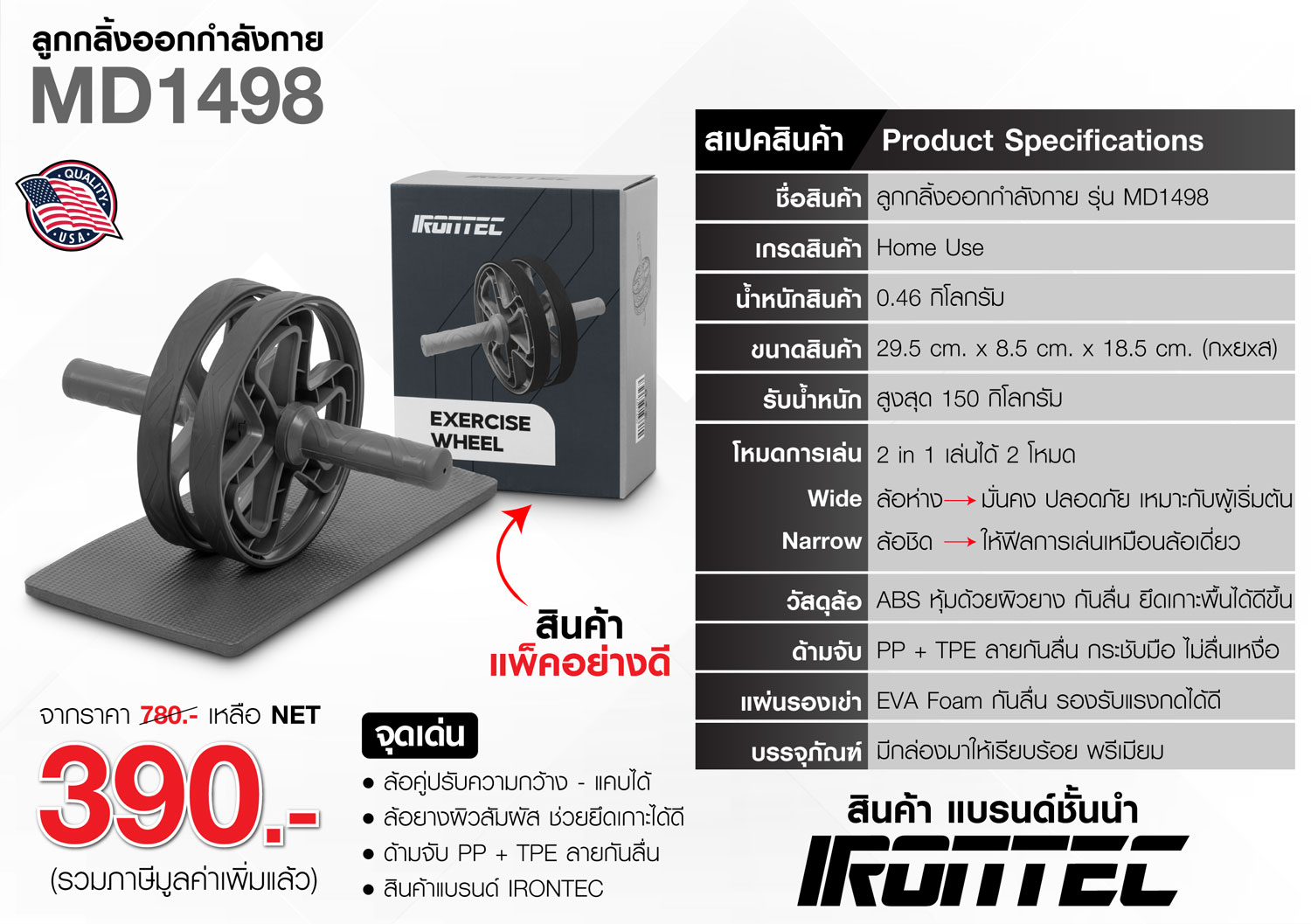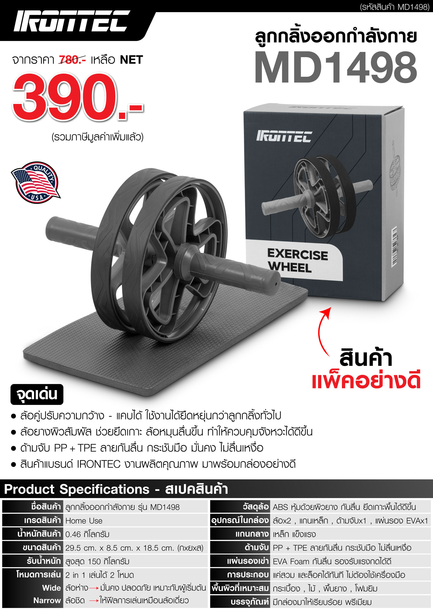 ลูกกลิ้งออกกำลังกาย IRONTEC รุ่น MD1498 ลูกกลิ้งล้อคู่เสถียร จับถนัดมือ ช่วยเสริมความแข็งแรงของหน้าท้อง แกนกลางลำตัว ไหล่ และหลังได้อย่างมีประสิทธิภาพ มาพร้อมแผ่นรองเข่าเพิ่มความนุ่มสบาย ตัวอุปกรณ์ทนทาน ใช้งานง่าย เหมาะสำหรับทั้งมือใหม่และผู้ที่ออกกำลังกายเป็นประจำ